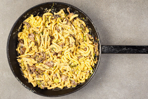 Manchmal geht doch nichts über so richtig gute Hausmannskost. Heute: Spätzle! Dazu: Die cremigste Pilzsauce, die du seit Langem vom leer gefutterten Teller geleckt hast! Die Mischung aus Crème fraîche, Käse und Steinpilzpulver macht’s. Aber auch die Gemüseeinlage aus Schnittlauch, Champignons und Lauch ist nicht ohne. Müssen wir noch mehr sagen? Oder sitzt du schon mit knurrendem Magen am Tisch und wartest sehnsüchtig?