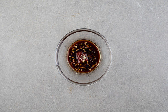 Den Knoblauch schälen und fein würfeln. Mit der Chilipaste, der ½ des Sesamöls, der Sojasauce, 1EL hellem Essig und 1TL Zucker verrühren.