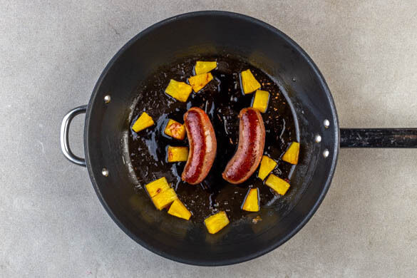 Die Würste in derselben Pfanne mit 1EL Pflanzenöl und dem Bratfett bei mittlerer Hitze 13–14Min. anbraten. Die ½ der Ananas samt Saft sowie die ½ der Teriyakisauce hinzufügen und 4–5Min. köcheln lassen, bis die Sauce eingedickt ist und die Würste gar sind. (Die übrige Ananas und Teriyakisauce wird für dieses Rezept nicht benötigt.)