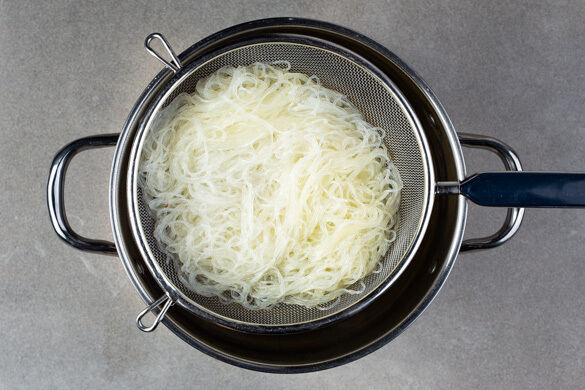 In einem mittelgroßen Topf ausreichend gesalzenes Wasser für die Nudeln aufkochen. Die Nudeln in das kochende Wasser geben, den Topf vom Herd nehmen und die Nudeln 3–5Min. gar ziehen lassen. In ein Sieb abgießen, dann mit 2TL Pflanzenöl vermengen, damit die Nudeln nicht zusammenkleben.