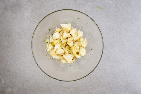 Den Knoblauch schälen und sehr fein würfeln oder reiben. Mit den restlichen gehackten Kräutern und 3EL Olivenöl verrühren. Die Brötchen in mundgerechte Stücke zupfen und mit dem Knoblauch-Kräuter-Öl vermengen.