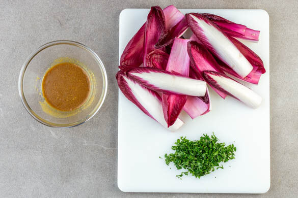 1EL Olivenöl und 1EL Balsamicoessig, ½TL Senf, je 1 kräftige Prise Salz und Pfeffer sowie 1 Prise Zucker zu einem Dressing verrühren. Die Petersilie fein hacken. Das Strunkende des Chicorées abschneiden und die Blätter voneinander lösen, große Blätter ggf. halbieren.
