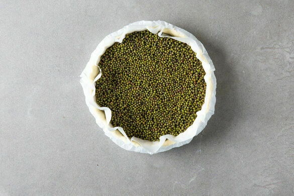 Den Backofen auf 200°C (180°C Umluft) vorheizen. Den Blätterteig in eine ca. 26cm große, runde Quicheform ausrollen, überschüssigen Teig ggf. wegschneiden. Vorhandene Lücken mit den Teigstücken füllen und die Teigränder zusammendrücken. Mit Backpapier und Reis oder trockenen Hülsenfrüchten als Backgewicht bedecken und 10–15Min. im Ofen vorbacken.