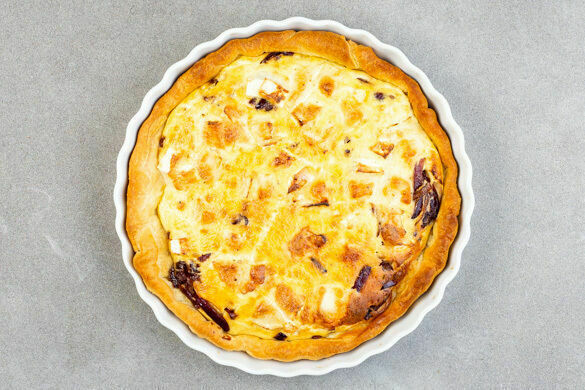 Den vorgebackenen Teig aus dem Ofen nehmen, das Backpapier und Backgewicht entfernen, anschließend die Zwiebeln gleichmäßig darauf verteilen. Den Käse mit einem kleinen Löffel auf die Zwiebeln klecksen. Den Teig mit der Ei-Mischung füllen und im Ofen 20–25Min. backen, bis die Füllung gestockt ist. Die Quiche ca. 5Min. auskühlen lassen.