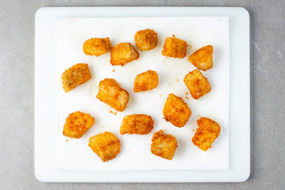 Die Fischnuggets in einer mittelgroßen Pfanne mit 2EL Pflanzenöl bei mittlerer Hitze auf jeder Seite in 2–3Min. goldbraun und gar braten. Anschließend auf etwas Küchenkrepp abtropfen lassen.