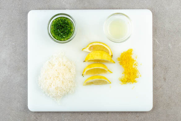 Nebenher den Schnittlauch in möglichst feine Röllchen schneiden und diese mit 2EL Olivenöl mischen. Das Kräuteröl für später beiseitestellen. Die Zitronenschale fein abreiben und die Zitrone halbieren, eine Hälfte auspressen, die andere Hälfte in Spalten schneiden. Den Käse fein reiben.
