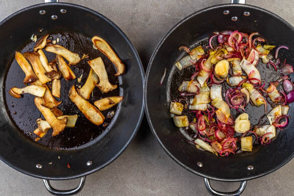 Den Backofen auf 220°C (200°C Umluft) vorheizen. Die Zwiebeln schälen, halbieren und in feine Streifen schneiden. Den Chicorée quer in ca. 2cm dicke Streifen schneiden, dabei den Strunk entfernen. Die Pilze längs in ca. 0,5cm breite Scheiben schneiden.