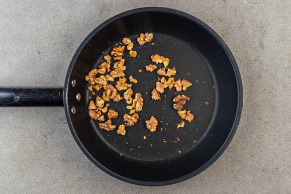 Den Backofen auf 220°C (200°C Umluft) vorheizen. In einem kleinen Topf ausreichend Wasser für die Eier zum Kochen bringen. Die Walnüsse in einer kleinen Pfanne ohne Zugabe von Fett bei mittlerer Hitze 2–3Min. anrösten. Vorsicht, sie können schnell zu dunkel werden. Zum Abkühlen aus der Pfanne nehmen und beiseitestellen.