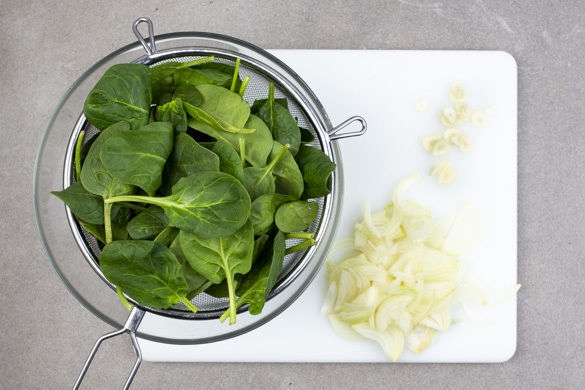 In einem großen Topf ausreichend gesalzenes Wasser für die Pasta zum Kochen bringen. Die Zwiebel schälen, halbieren und feine Streifen schneiden. Den Knoblauch schälen und in feine Scheibchen schneiden. Den Spinat ggf. verlesen.