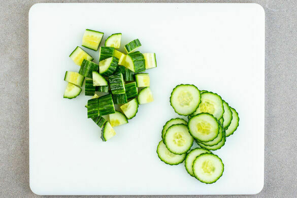 Ca. ⅓ der Gurken in sehr dünne Scheiben schneiden oder hobeln und beiseitelegen. Die übrige Gurke grob würfeln, in die Suppe rühren und ca. 5Min. erhitzen.