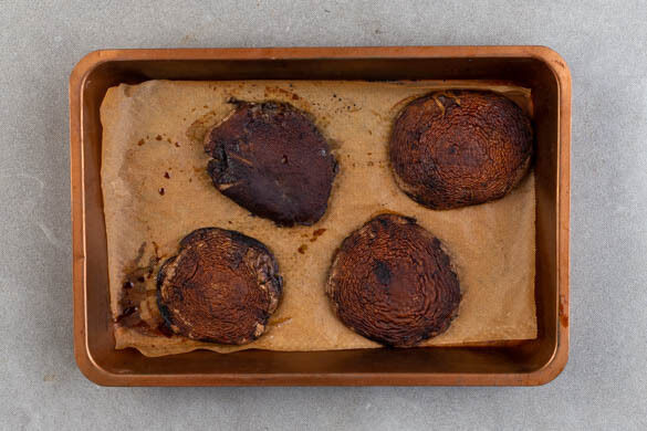 1EL Sojasauce mit 1EL Olivenöl und 2EL Balsamicoessig verrühren. Die Pilze rundum mit dem Würzöl bestreichen und mit der Außenseite nach oben in eine mit Backpapier ausgelegte Auflaufform geben. Im unteren Teil des Ofens 10–12Min. backen, bis die Pilze gar sind. Den Pilzbratensaft aufbewahren.