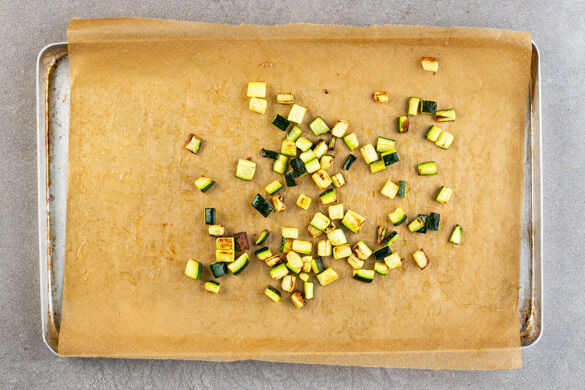 Den Backofen auf 220°C Umluft (240°C Ober-/Unterhitze) vorheizen. Die Zucchini der Länge nach halbieren und in ca. 1cm große Würfel schneiden. Die Kirschtomaten halbieren.