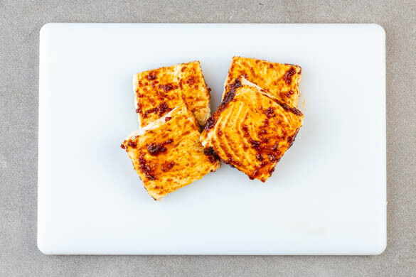 Den Tofu trocken tupfen, einmal quer und einmal horizontal halbieren und rundum mit dem Sambal Badjak einreiben.