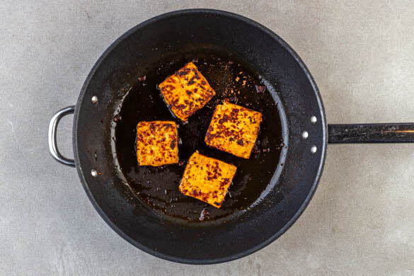 In einer mittelgroßen Pfanne 1EL Pflanzenöl bei mittlerer bis starker Hitze erwärmen. Den Tofu in das heiße Öl geben und in ca. 5Min. rundum goldbraun braten.