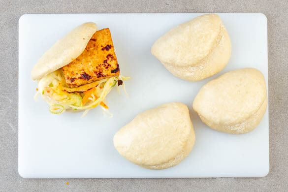 Die Innenseiten der Hefebrötchen jeweils mit ½EL veganer Mayonnaise bestreichen, dann nach Belieben mit dem Krautsalat, dem Tofu und einigen Erdnüssen füllen. Den restlichen Krautsalat mit den restlichen Erdnüssen garnieren und mit den Baos servieren.