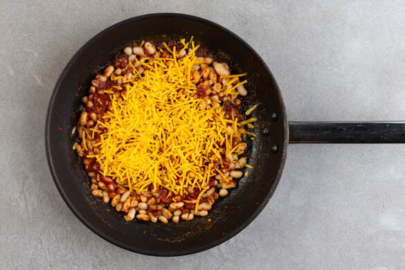 Das Tomatenmark, die Bohnen, 2EL Wasser sowie je 1 Prise Salz und Pfeffer in die Pfanne geben und alles gründlich vermengen. Den Käse darüberstreuen und die Bohnen im Ofen 6–8Min. überbacken, bis der Käse goldbraun ist und Blasen wirft.