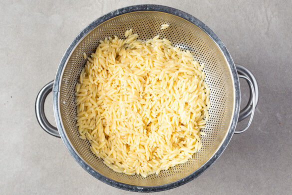 Risoni können auch den größten Foodie schon mal aus der Fassung bringen, denn was da aussieht wie Reis, ist in Wirklichkeit eine Sorte Pasta! Was, echt? Ja, echt! Und sie passen einfach fantastisch zu dem herzhaften Gemüse, das sich genüsslich in der veganen Sauce aus Mandeln, Violife Creamy und Zitrone suhlt. Minze verleiht einen zusätzlichen Frischekick, Hefeflocken sorgen für einen herzhaften Genuss. Mmmm!