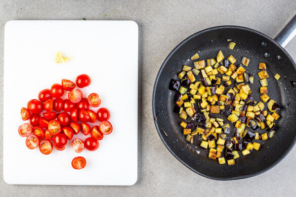 Die Auberginen in derselben Pfanne mit 2EL Olivenöl bei mittlerer bis starker Hitze in 8–10Min. weich braten, dabei gelegentlich umrühren und nach Geschmack mit Salz würzen. Den Knoblauch schälen und grob würfeln, die Kirschtomaten halbieren.