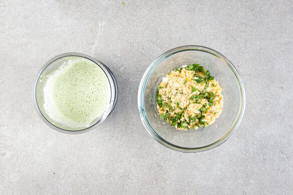 Die Minzeblätter von den Stängeln zupfen. Die ½ der Minze mit 1EL Zitronensaft in das hohe Gefäß geben und fein pürieren. Ggf. esslöffelweise Wasser hinzugeben und mit mehr Zitronensaft sowie Salz und Pfeffer würzen. Die restlichen Mandelblättchen grob hacken, die restliche Minze grob schneiden und beides mit der Zitronenschale sowie den Hefeflocken vermengen.