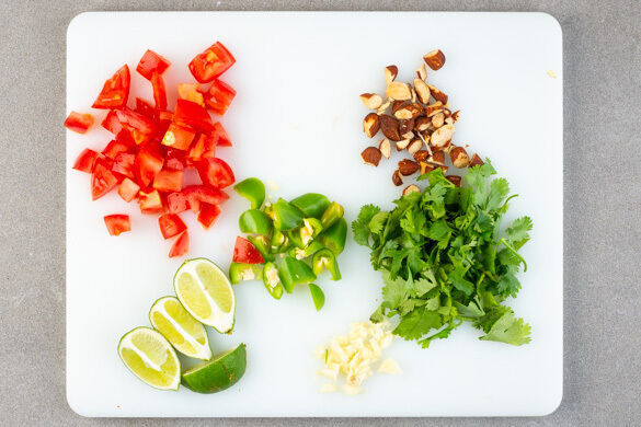 Den Knoblauch schälen und grob würfeln. Die Peperoni in feine Ringe schneiden. Tipp: Für weniger Schärfe die Kerne entfernen. Die Rauchmandeln grob hacken. Die Tomaten in ca. 1cm große Würfel schneiden. Den Koriander samt Stängeln grob schneiden. Die Limette halbieren, eine Hälfte auspressen, die andere Hälfte in Spalten schneiden.