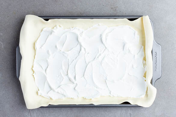 Den Teig mit dem Papier nach unten auf einem Backblech ausrollen. Tipp: Für eine runde oder ovale Galette den Teig entsprechend zuschneiden. Den Ziegenfrischkäse mit der Rückseite eines Löffels gleichmäßig auf dem Teig verstreichen, dabei einen Rand von ca. 3cm aussparen.