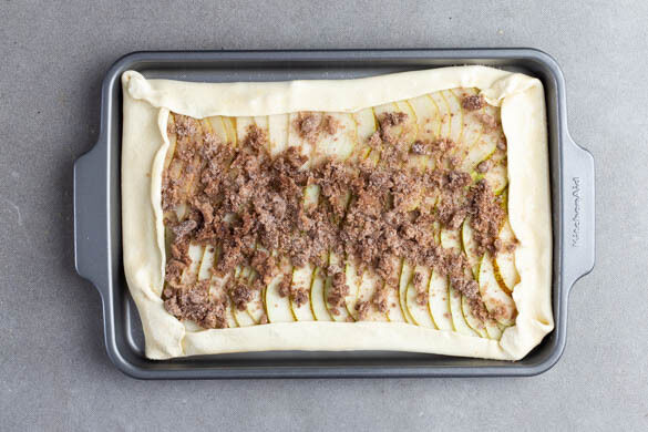 Die Streusel auf den Birnen verteilen, dann den freien Rand über die Füllung falten und festdrücken. 1 Ei verquirlen. Die Ränder der Galette mit dem verquirlten Ei bepinseln und mit etwas Zucker bestreuen. Die Galette im Ofen 15–18Min. goldbraun backen.