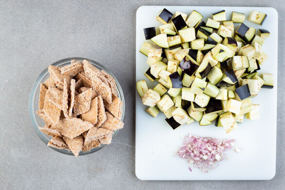Den Backofen auf 220°C (200°C Umluft) vorheizen. Die Auberginen in 1–2cm große Würfel schneiden. Die Schalotte schälen und grob würfeln. Die Pitabrote in ca. 3cm große Stücke schneiden.