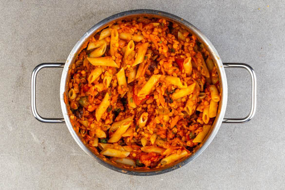 Die Kapern mit dem Oregano, den Oliven, den Tomatenwürfeln und den passierten Tomaten unterrühren, dann die Linsen samt Wasser zugeben und nach Bedarf mit 150–200ml Wasser ablöschen. Die Linsen-Bolognese bei mittlerer Hitze 15–20Min. köcheln lassen, bis die Linsen bissfest sind. Nach Geschmack mit Essig, Chili, der Gewürzmischung, Salz und Pfeffer würzen.