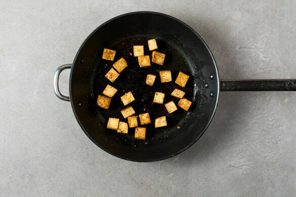Den Tofu trocken tupfen und in ca. 2cm große Würfel schneiden.
