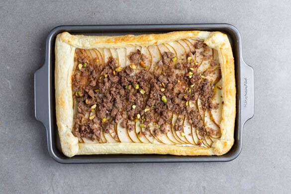 Die Pistazien grob hacken, ca. 5Min. vor Ende der Garzeit auf der Galette verteilen und mitbacken. Anschließend die Galette aus dem Ofen nehmen und mindestens 10–15Min. abkühlen lassen. Nach Belieben in Stücke schneiden und servieren.