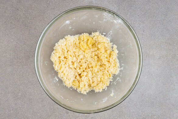 25g Butter in einer kleinen Pfanne bei mittlerer Hitze schmelzen lassen. Den Ingwer, 60g Zucker, ½TL Zimt, 45g Mehl und 1 kräftige Prise Salz vermengen, dann die geschmolzene Butter unterrühren und die Mischung mit den Händen zu lockeren Streuseln kneten.