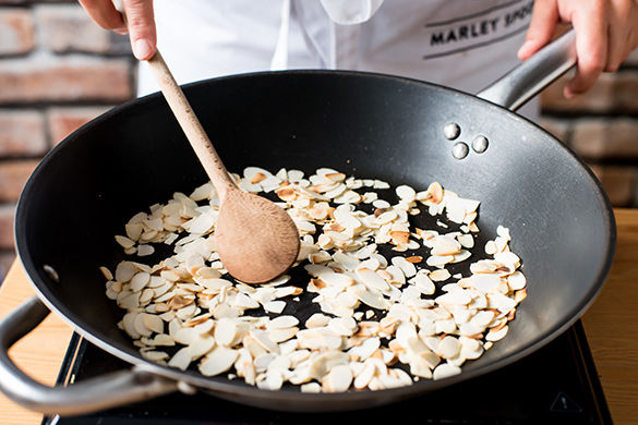 In einem mittelgroßen Topf ausreichend gesalzenes Wasser für die Pasta zum Kochen bringen. Die Mandelblättchen in einer großen Pfanne ohne Zugabe von Fett bei mittlerer Hitze vorsichtig 1–2Min. unter gelegentlichem Rühren goldbraun anrösten. Vorsicht, die Mandeln können schnell verbrennen. Die Mandeln zum Abkühlen aus der Pfanne nehmen und beiseitestellen.