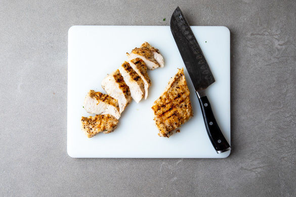Das Fleisch mit etwas Küchenkrepp trocken tupfen, in __2 gleich große Stücke-_ schneiden und mit 1EL Olivenöl sowie Salz und Pfeffer einreiben. In einer Grillpfanne oder einer normalen Pfanne bei mittlerer Hitze auf jeder Seite 3–4Min. goldbraun anbraten. Auf einem Teller abgedeckt ruhen lassen.