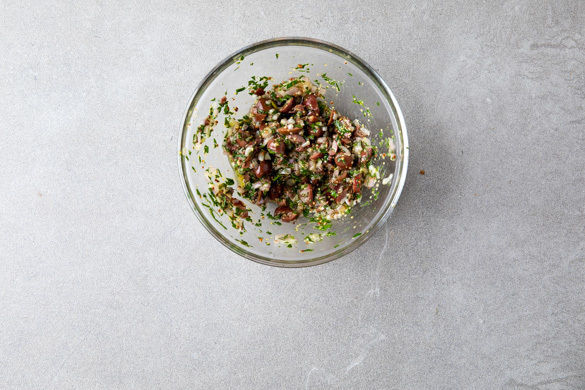 Die Schalotte schälen und fein würfeln. Die Petersilienblätter abzupfen und fein hacken. Die Oliven grob hacken und mit den Schalotten, der Petersilie, dem restlichen Senf, 1TL Zitronensaft, 1–2TL Olivenöl und 2–3TL Wasser vermengen.