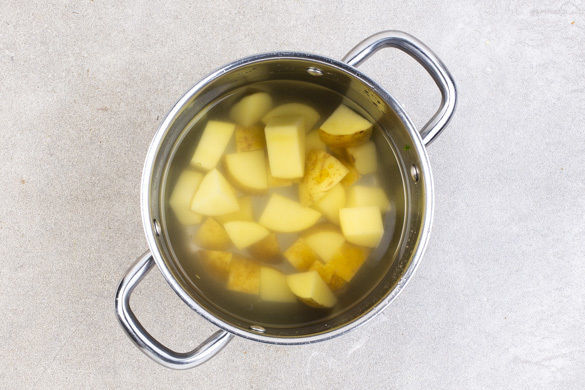 Den Backofen mit Grillfunktion auf 230°C vorheizen. In einem mittelgroßen Topf ausreichend gesalzenes Wasser für die Kartoffeln zum Kochen bringen. Die Kartoffeln in mundgerechte Stücke schneiden und im kochenden Wasser in 12–15Min. bissfest kochen. In ein Sieb abgießen und abkühlen lassen.