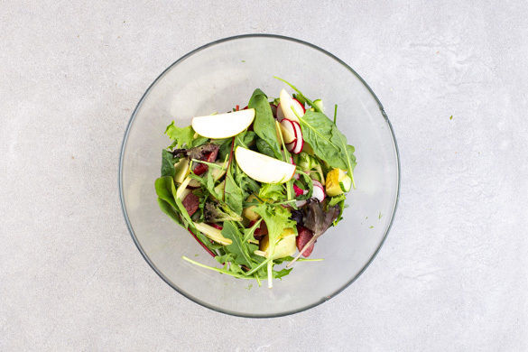 Die Kartoffeln, die Wurstscheiben, die Radieschen, die Gurken, die Äpfel, den gemischten Salat und ca. 2/3 der Kräuter mit dem Dressing vermengen. Den Salat mit Salz und Pfeffer abschmecken und mit den restlichen Kräutern garniert servieren.