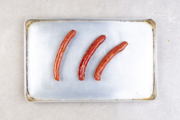 Die Chipolatas auf ein Backblech geben und 10–15Min. im Ofen grillen, bis die Würste goldbraun und knusprig sind. Nach der Hälfte der Zeit wenden.