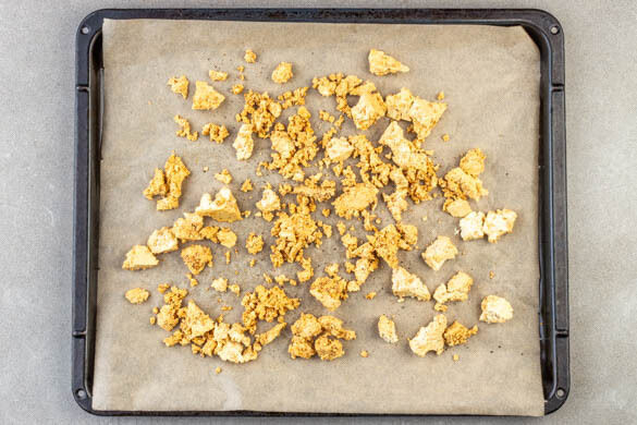 Den Tofu trocken tupfen und mit den Fingern zerbröseln. 1EL Pflanzenöl mit der Sojasauce und ca. ⅓ des Sesams gut verrühren und mit dem Tofu vermengen. Den Tofu auf einem mit Backpapier ausgelegten Backblech verteilen, mit je 1 Prise Salz und Pfeffer würzen und im Ofen in ca. 15Min. knusprig rösten.