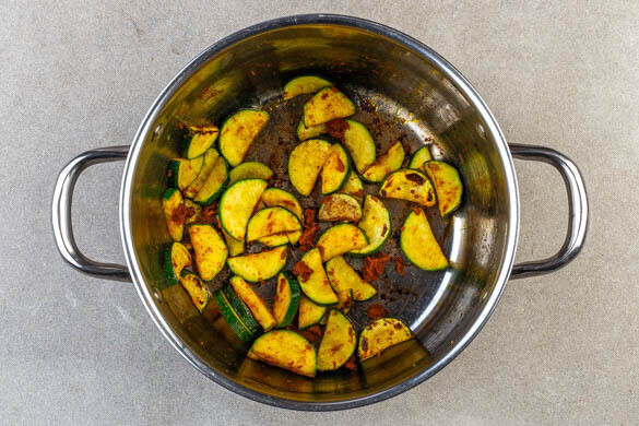 Die Zucchini in dem Topf mit 1EL Pflanzenöl bei mittlerer Hitze 2–3Min. anbraten. Dann ca. ⅓ der Currypaste hinzugeben und ca. 1Min. unter Rühren mitbraten.