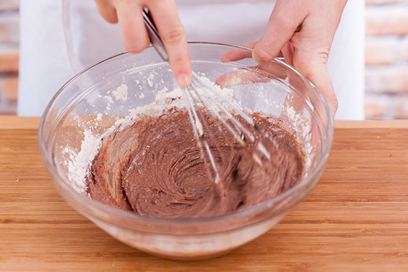 Die Hälfte des Zuckers mit 2/3 des Kakaos, 130g Mehl, 1/2 TL Backpulver, 1 Ei, geschmolzener und leicht abgekühlter Butter und 75ml Milch mithilfe eines Schneebesens zu einem glatten Teig vermengen.