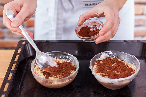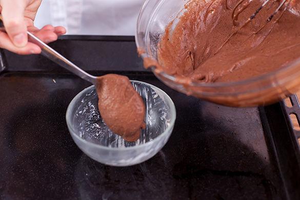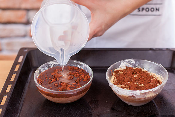 Den Teig auf die beiden Schalen verteilen und auf ein Backblech stellen. 170ml Wasser mit einem Wasserkocher oder in einem Topf zum Kochen bringen.