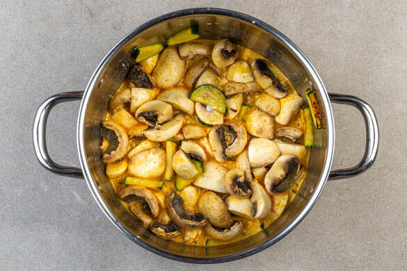 Die Zucchini mit der Kokosmilch und 500ml Wasser ablöschen und die Pilze unterrühren. Die Suppe 5–7Min. sanft köcheln lassen. Mit ggf. mehr Currypaste sowie Salz und Pfeffer abschmecken.