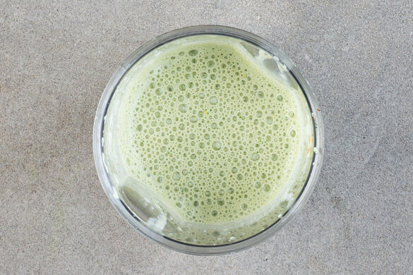 Den Violife Creamy, das Basilikum, 1TL Zitronenschale, 1EL Wasser und die ½ der Gewürzmischung in einem hohen Gefäß mit einem Stabmixer zu einer cremigen Sauce pürieren. Je nach gewünschter Konsistenz mehr Wasser hinzugeben. Mit Salz, Pfeffer, Zitronensaft und ggf. mehr von der Gewürzmischung abschmecken.