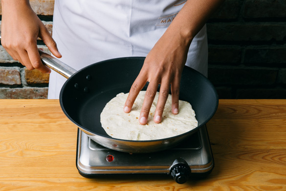 Eine große Pfanne auf mittlerer Stufe erhitzen. Die Tortillas nacheinander ohne Zugabe von Fett auf jeder Seite ca. 30Sek. aufwärmen, dann aus der Pfanne nehmen und warm halten.