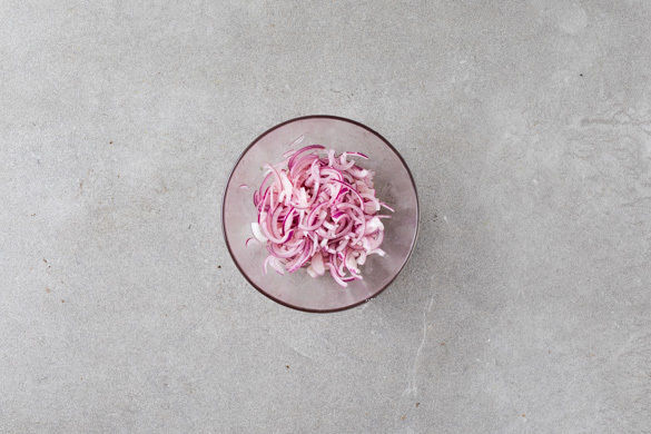 Die Limette halbieren und auspressen. Die Zwiebel schälen, halbieren, in dünne Streifen schneiden und mit 1–2EL Limettensaft, 2–3EL Essig, 1TL Zucker und ½TL Salz vermengen. So lange rühren, bis der Zucker sich aufgelöst hat. Die Zwiebeln sollten gut bedeckt sein. Beiseitestellen und zwischendurch gelegentlich umrühren.