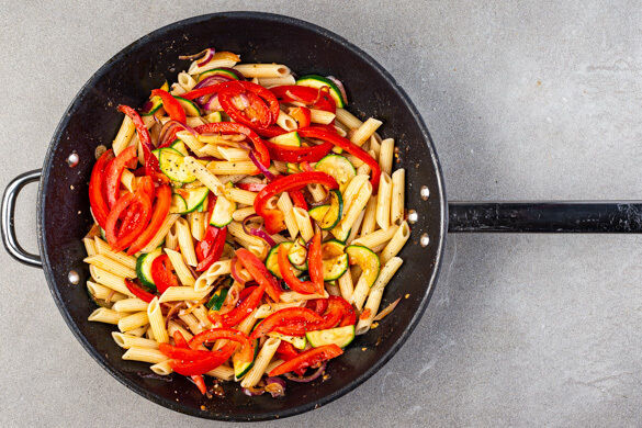 Rindergeschnetzeltes mit Penne und Paprika-Zucchini-Gemüse