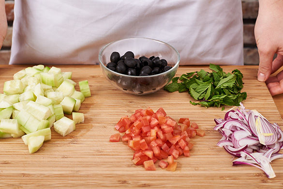 Gurke schälen, der Länge nach halbieren und in ca. 1-2cm kleine Würfel schneiden. Tomaten vierteln, das Kerngehäuse herausschneiden und aufheben. Dann den Rest der Tomaten in ca. 1-2cm kleine Würfel schneiden. Zwiebel schälen, halbieren und in feine Streifen schneiden. Oliven in einem Sieb abtropfen lassen.