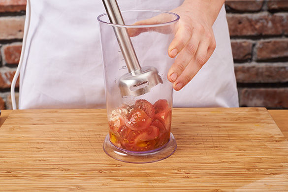 Inzwischen die Tomatenkerne in einem hohen Gefäß mit dem restlichem Knoblauch, 1-2EL Olivenöl sowie Salz und Pfeffer zu einem Dressing fein pürieren. Die Minzblätter von den Stielen zupfen und grob hacken.