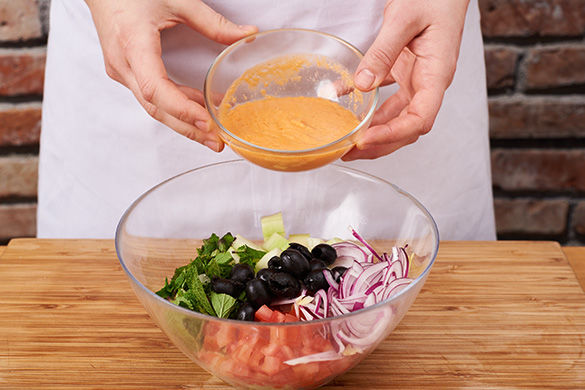 In einer großen Schüssel Tomaten, Gurken, Zwiebel, Minze und abgetropfte Oliven mit dem Dressing vermischen, evtl. nochmals abschmecken. Salat mit Brötchen und Spießen anrichten.