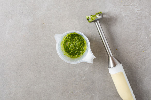 Den Bärlauch in dünne Streifen schneiden und den Käse grob reiben. Beides zusammen mit ca. 2-3EL Olivenöl mit einem Stabmixer zu einem Pesto verarbeiten, bei Bedarf etwas mehr Öl hinzufügen.